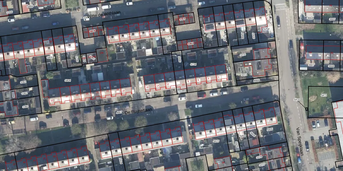 Het perceel waarop De Ruyterlaan 12 staat heeft een oppervlakte van 3481 m². Dit is een zeer groot perceel. De perceeloppervlakte wordt geregistreerd door het Kadaster. Gedetailleerde informatie over de maten van dit perceel kunt u vinden in het rapport Kadastrale kaart met maatvoering van De Ruyterlaan 12.