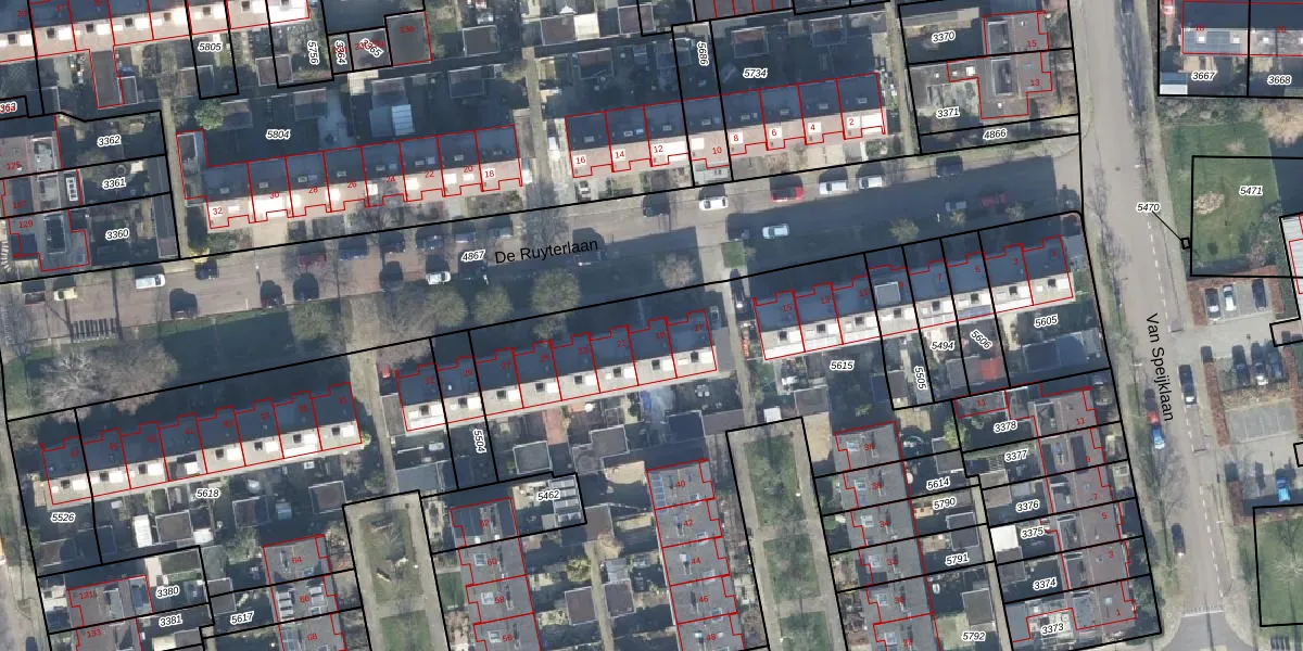 Het perceel waarop De Ruyterlaan 19 staat heeft een oppervlakte van 3248 m². Dit is een zeer groot perceel. De perceeloppervlakte wordt geregistreerd door het Kadaster. Gedetailleerde informatie over de maten van dit perceel kunt u vinden in het rapport Kadastrale kaart met maatvoering van De Ruyterlaan 19.