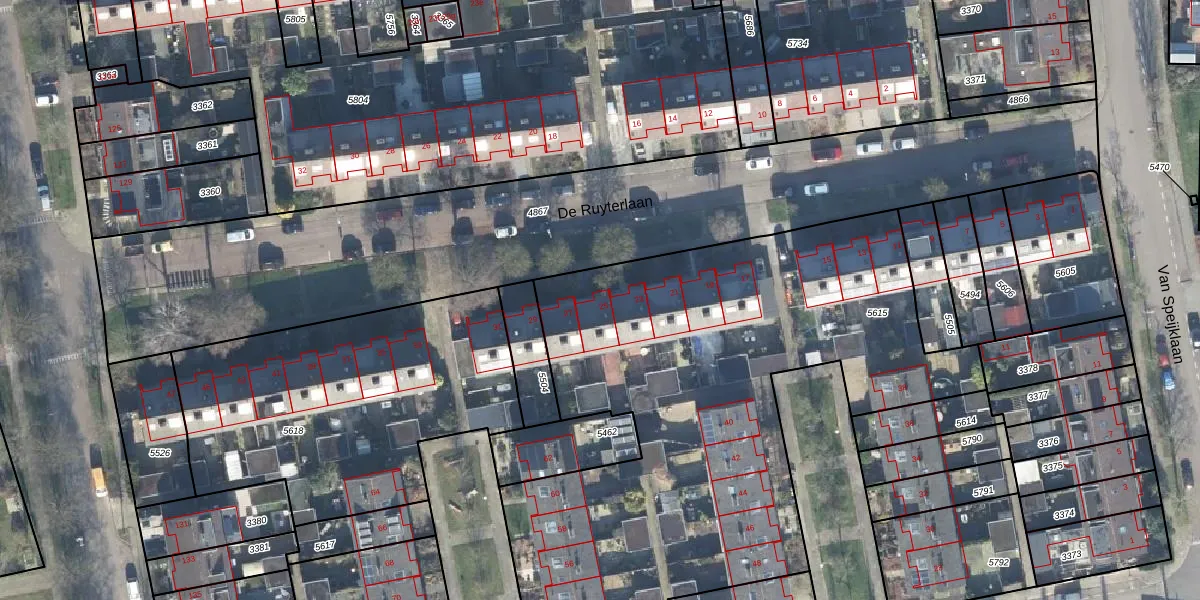 Het perceel waarop De Ruyterlaan 25 staat heeft een oppervlakte van 3248 m². Dit is een zeer groot perceel. De perceeloppervlakte wordt geregistreerd door het Kadaster. Gedetailleerde informatie over de maten van dit perceel kunt u vinden in het rapport Kadastrale kaart met maatvoering van De Ruyterlaan 25.
