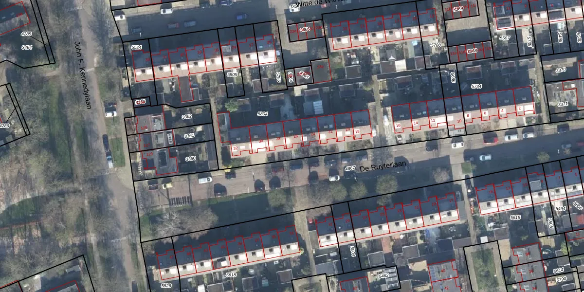 Het perceel waarop De Ruyterlaan 26 staat heeft een oppervlakte van 3481 m². Dit is een zeer groot perceel. De perceeloppervlakte wordt geregistreerd door het Kadaster. Gedetailleerde informatie over de maten van dit perceel kunt u vinden in het rapport Kadastrale kaart met maatvoering van De Ruyterlaan 26.