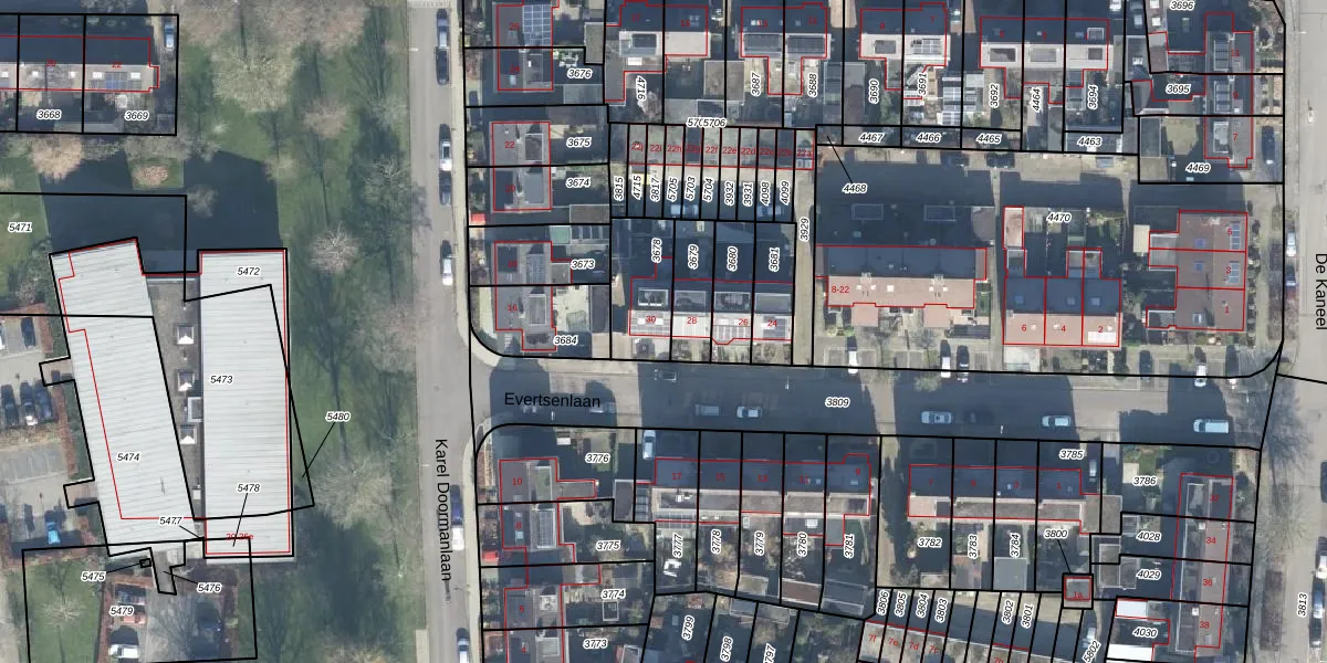 Evertsenlaan 30 is gelegen op kadastraal perceel WDB02B3678. Deze kadastrale aanduiding is uniek en wordt gebruikt door het Kadaster om eigendomsrechten en andere zakelijke rechten vast te leggen. Het perceel maakt onderdeel uit van de kadastrale gemeente Woudenberg.