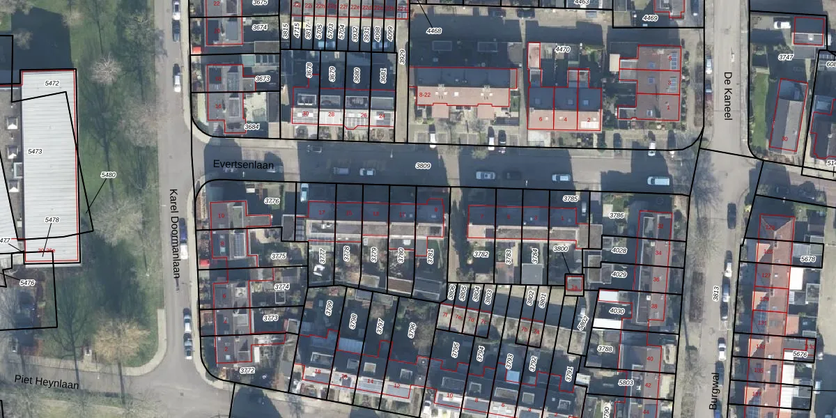 Evertsenlaan 9 is gelegen op kadastraal perceel WDB02B3781. Deze kadastrale aanduiding is uniek en wordt gebruikt door het Kadaster om eigendomsrechten en andere zakelijke rechten vast te leggen. Het perceel maakt onderdeel uit van de kadastrale gemeente Woudenberg.