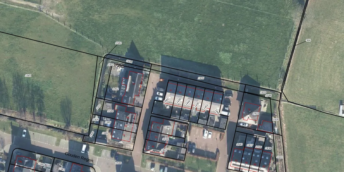 Het perceel waarop Gouden Regen 67 staat heeft een oppervlakte van 163 m². Dit is een middelgroot perceel. De perceeloppervlakte wordt geregistreerd door het Kadaster. Gedetailleerde informatie over de maten van dit perceel kunt u vinden in het rapport Kadastrale kaart met maatvoering van Gouden Regen 67.