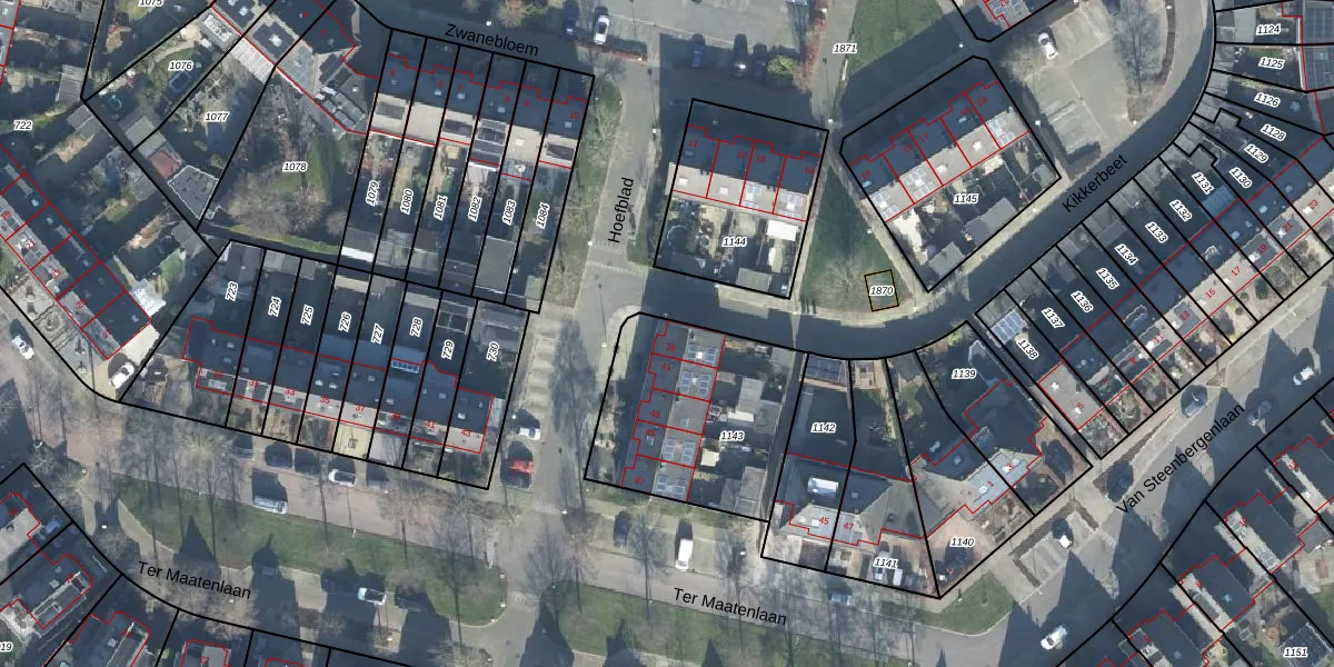 Het perceel waarop Hoefblad 39 staat heeft een oppervlakte van 737 m². Dit is een groot perceel. De perceeloppervlakte wordt geregistreerd door het Kadaster. Gedetailleerde informatie over de maten van dit perceel kunt u vinden in het rapport Kadastrale kaart met maatvoering van Hoefblad 39.