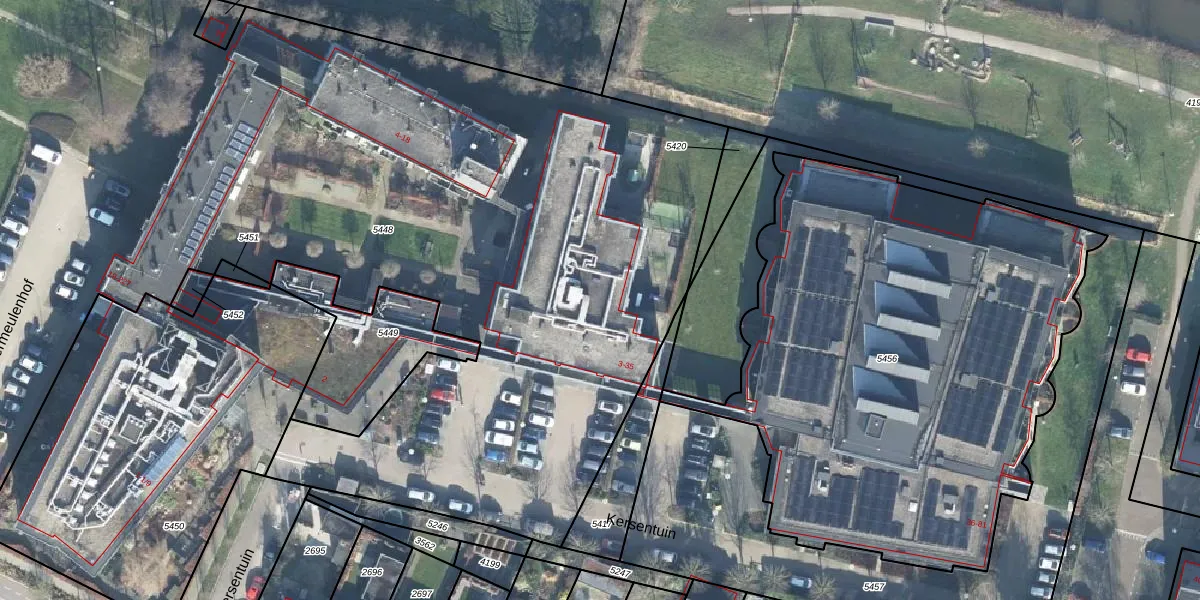 Het perceel waarop Kersentuin 22 staat heeft een oppervlakte van 1,2 ha. Dit is een zeer groot perceel. De perceeloppervlakte wordt geregistreerd door het Kadaster. Gedetailleerde informatie over de maten van dit perceel kunt u vinden in het rapport Kadastrale kaart met maatvoering van Kersentuin 22.