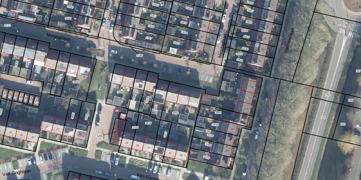 Het perceel waarop Mesdaglaan 30 staat heeft een oppervlakte van 1250 m². Dit is een zeer groot perceel. De perceeloppervlakte wordt geregistreerd door het Kadaster. Gedetailleerde informatie over de maten van dit perceel kunt u vinden in het rapport Kadastrale kaart met maatvoering van Mesdaglaan 30.