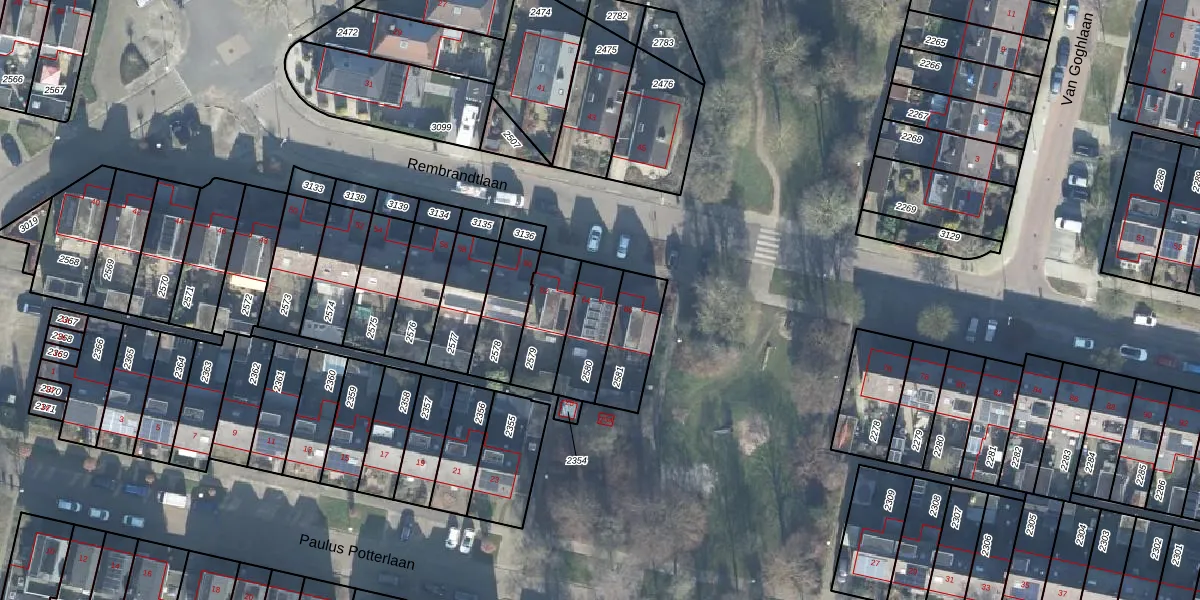Het perceel waarop Rembrandtlaan 64 staat heeft een oppervlakte van 163 m². Dit is een middelgroot perceel. De perceeloppervlakte wordt geregistreerd door het Kadaster. Gedetailleerde informatie over de maten van dit perceel kunt u vinden in het rapport Kadastrale kaart met maatvoering van Rembrandtlaan 64.