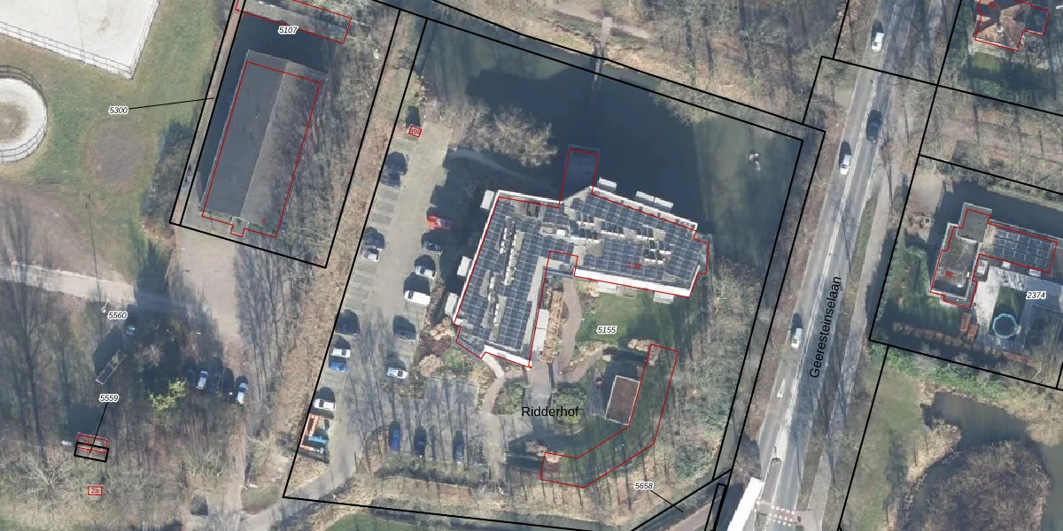 Het perceel waarop Ridderhof 13 staat heeft een oppervlakte van 6470 m². Dit is een zeer groot perceel. De perceeloppervlakte wordt geregistreerd door het Kadaster. Gedetailleerde informatie over de maten van dit perceel kunt u vinden in het rapport Kadastrale kaart met maatvoering van Ridderhof 13.