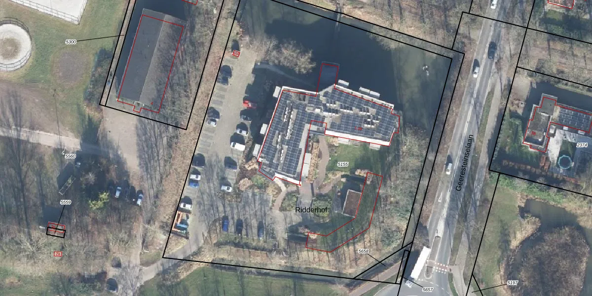 Het perceel waarop Ridderhof 14 staat heeft een oppervlakte van 6470 m². Dit is een zeer groot perceel. De perceeloppervlakte wordt geregistreerd door het Kadaster. Gedetailleerde informatie over de maten van dit perceel kunt u vinden in het rapport Kadastrale kaart met maatvoering van Ridderhof 14.