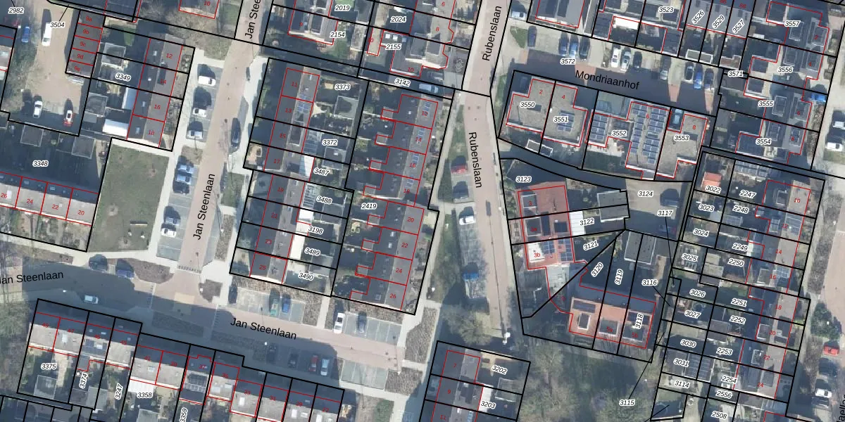 Het perceel waarop Rubenslaan 20 staat heeft een oppervlakte van 1047 m². Dit is een zeer groot perceel. De perceeloppervlakte wordt geregistreerd door het Kadaster. Gedetailleerde informatie over de maten van dit perceel kunt u vinden in het rapport Kadastrale kaart met maatvoering van Rubenslaan 20.