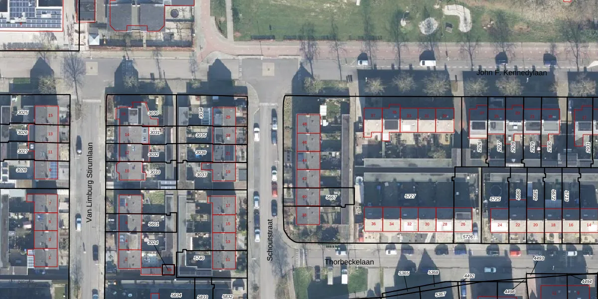 Het perceel waarop Schoutstraat 46 staat heeft een oppervlakte van 2653 m². Dit is een zeer groot perceel. De perceeloppervlakte wordt geregistreerd door het Kadaster. Gedetailleerde informatie over de maten van dit perceel kunt u vinden in het rapport Kadastrale kaart met maatvoering van Schoutstraat 46.