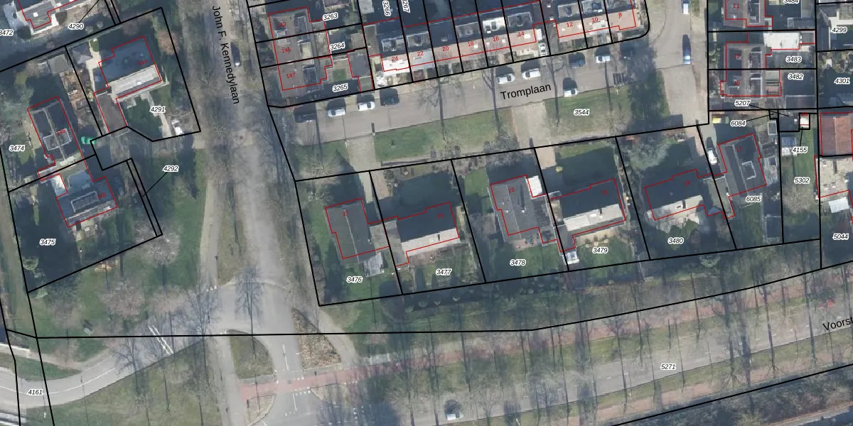 Het perceel waarop Tromplaan 25 staat heeft een oppervlakte van 590 m². Dit is een groot perceel. De perceeloppervlakte wordt geregistreerd door het Kadaster. Gedetailleerde informatie over de maten van dit perceel kunt u vinden in het rapport Kadastrale kaart met maatvoering van Tromplaan 25.