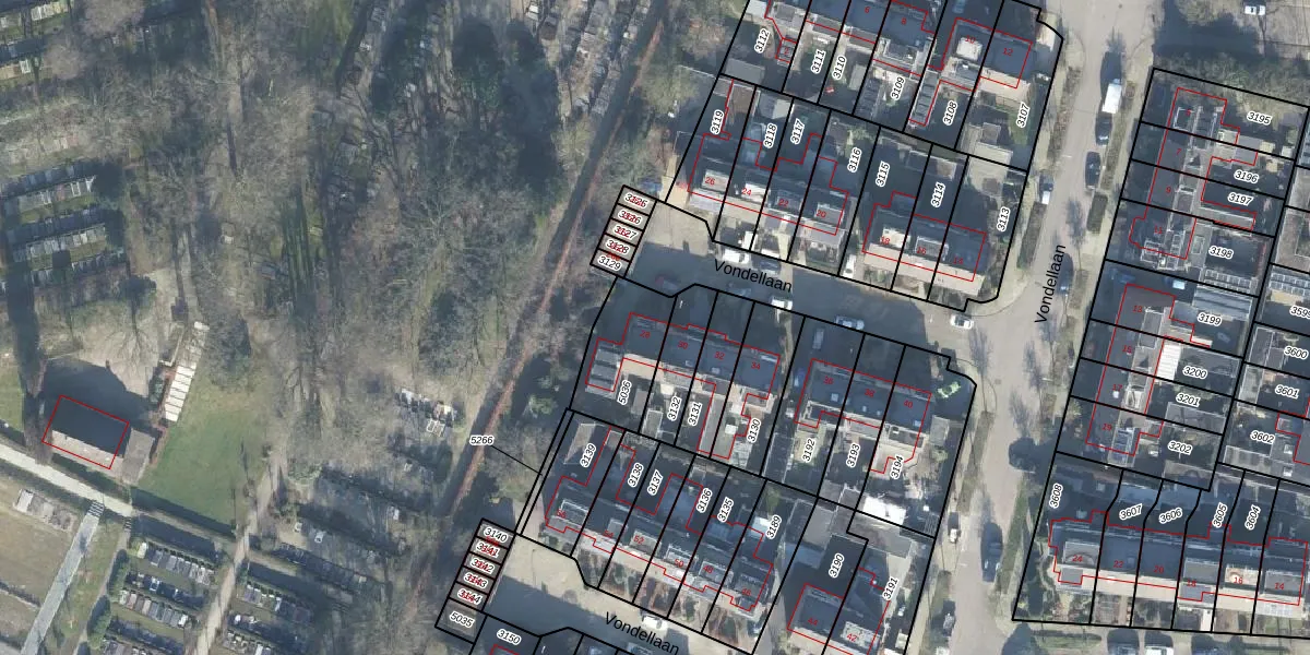 Het perceel waarop Vondellaan 28 staat heeft een oppervlakte van 229 m². Dit is een middelgroot perceel. De perceeloppervlakte wordt geregistreerd door het Kadaster. Gedetailleerde informatie over de maten van dit perceel kunt u vinden in het rapport Kadastrale kaart met maatvoering van Vondellaan 28.
