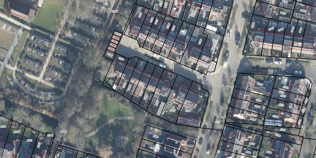 Het perceel waarop Vondellaan 66 staat heeft een oppervlakte van 162 m². Dit is een middelgroot perceel. De perceeloppervlakte wordt geregistreerd door het Kadaster. Gedetailleerde informatie over de maten van dit perceel kunt u vinden in het rapport Kadastrale kaart met maatvoering van Vondellaan 66.