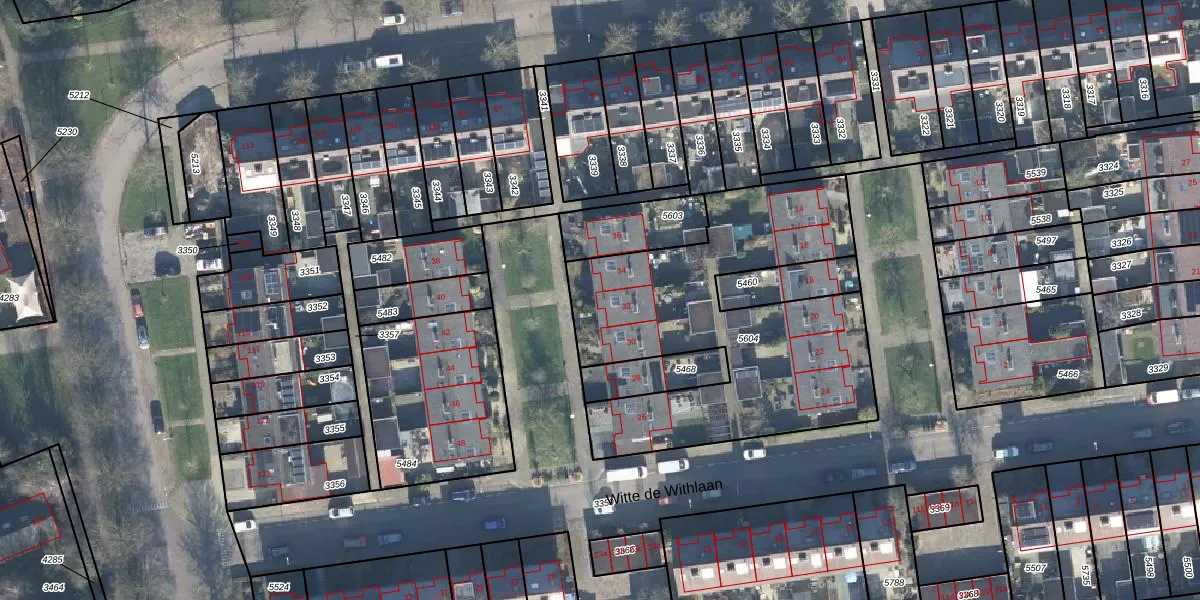 Het perceel waarop Witte de Withlaan 32 staat heeft een oppervlakte van 1508 m². Dit is een zeer groot perceel. De perceeloppervlakte wordt geregistreerd door het Kadaster. Gedetailleerde informatie over de maten van dit perceel kunt u vinden in het rapport Kadastrale kaart met maatvoering van Witte de Withlaan 32.