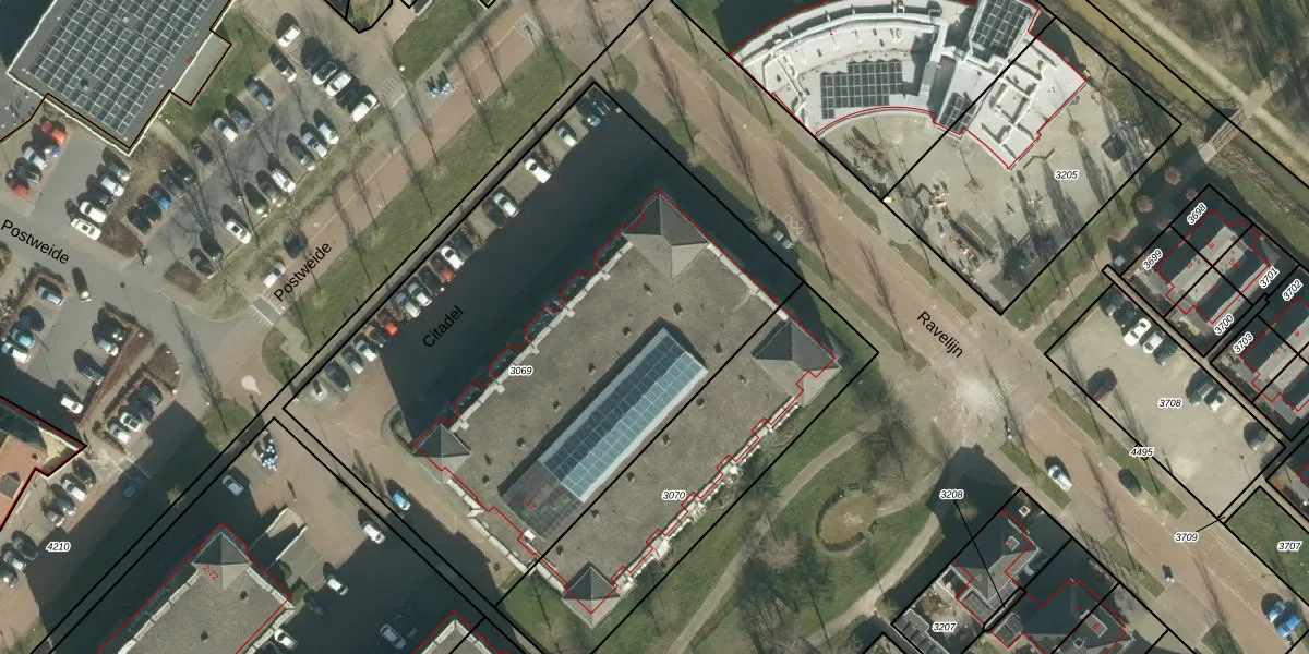 Het perceel waarop Citadel 71 staat heeft een oppervlakte van 3045 m². Dit is een zeer groot perceel. De perceeloppervlakte wordt geregistreerd door het Kadaster. Gedetailleerde informatie over de maten van dit perceel kunt u vinden in het rapport Kadastrale kaart met maatvoering van Citadel 71.