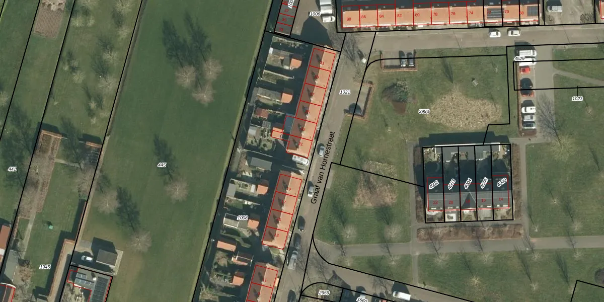 Het perceel waarop Graaf van Hornestraat 21 staat heeft een oppervlakte van 3030 m². Dit is een zeer groot perceel. De perceeloppervlakte wordt geregistreerd door het Kadaster. Gedetailleerde informatie over de maten van dit perceel kunt u vinden in het rapport Kadastrale kaart met maatvoering van Graaf van Hornestraat 21.
