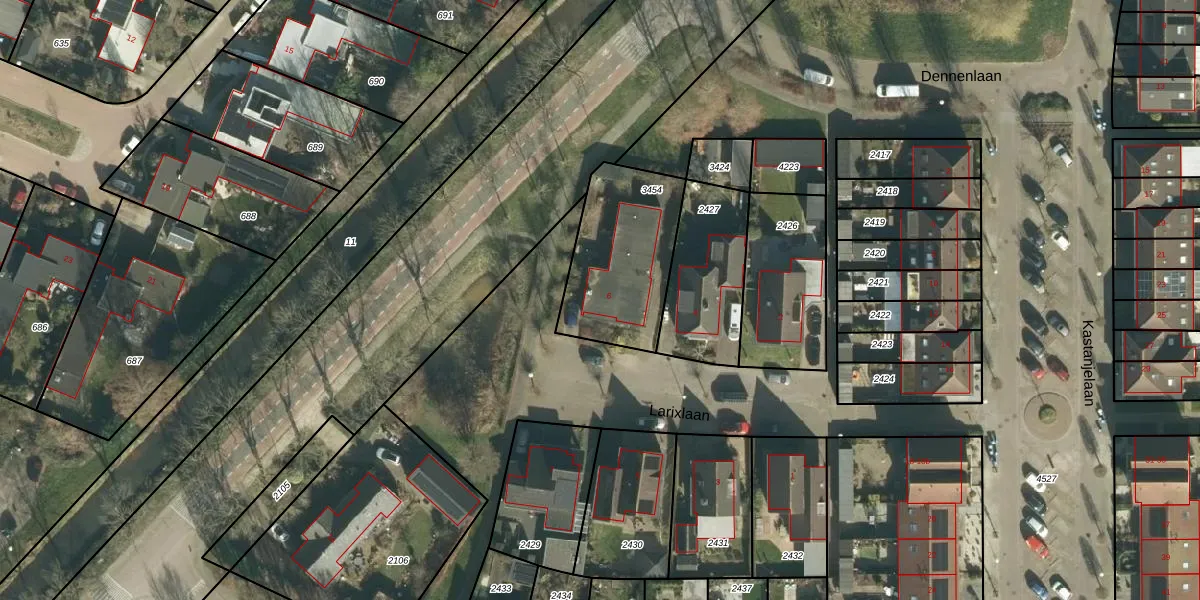 Larixlaan 6 is gelegen op kadastraal perceel WDC00H3454. Deze kadastrale aanduiding is uniek en wordt gebruikt door het Kadaster om eigendomsrechten en andere zakelijke rechten vast te leggen. Het perceel maakt onderdeel uit van de kadastrale gemeente Woudrichem.