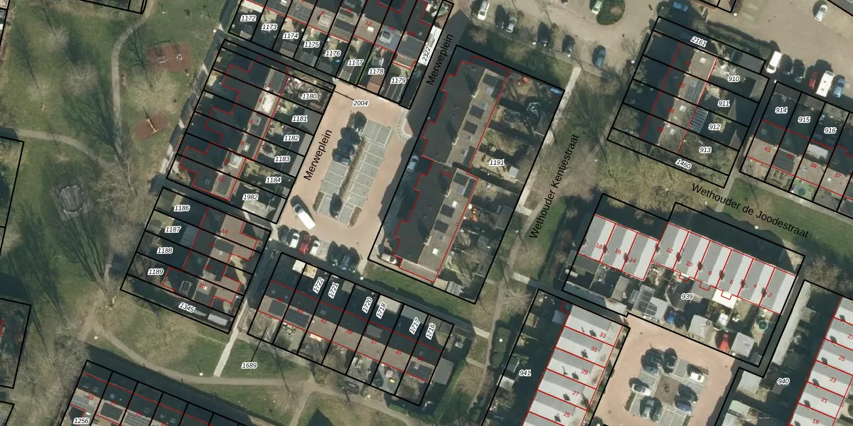 Het perceel waarop Merweplein 23 staat heeft een oppervlakte van 1472 m². Dit is een zeer groot perceel. De perceeloppervlakte wordt geregistreerd door het Kadaster. Gedetailleerde informatie over de maten van dit perceel kunt u vinden in het rapport Kadastrale kaart met maatvoering van Merweplein 23.