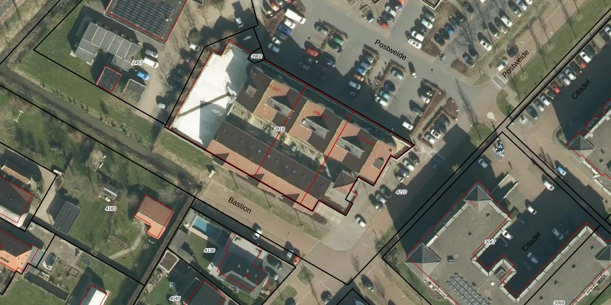 Het perceel waarop Postweide 117 staat heeft een oppervlakte van 2410 m². Dit is een zeer groot perceel. De perceeloppervlakte wordt geregistreerd door het Kadaster. Gedetailleerde informatie over de maten van dit perceel kunt u vinden in het rapport Kadastrale kaart met maatvoering van Postweide 117.