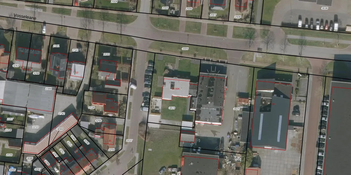 Vosseleane 16 is gelegen op kadastraal perceel WED00A3419. Deze kadastrale aanduiding is uniek en wordt gebruikt door het Kadaster om eigendomsrechten en andere zakelijke rechten vast te leggen. Het perceel maakt onderdeel uit van de kadastrale gemeente Woudsend.