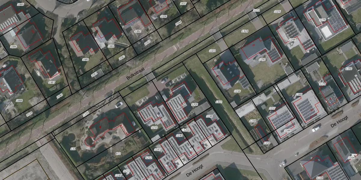 Het perceel waarop Bulkstraat 14 staat heeft een oppervlakte van 614 m². Dit is een groot perceel. De perceeloppervlakte wordt geregistreerd door het Kadaster. Gedetailleerde informatie over de maten van dit perceel kunt u vinden in het rapport Kadastrale kaart met maatvoering van Bulkstraat 14.