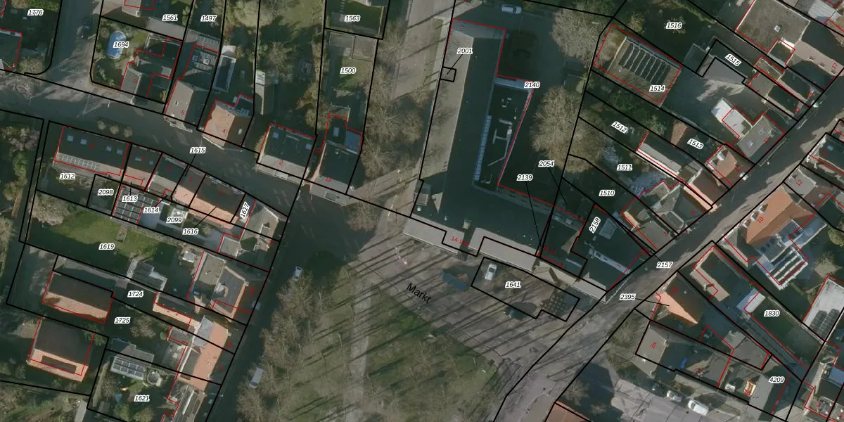 Het perceel waarop Markt 14-w staat heeft een oppervlakte van 1962 m². Dit is een zeer groot perceel. De perceeloppervlakte wordt geregistreerd door het Kadaster. Gedetailleerde informatie over de maten van dit perceel kunt u vinden in het rapport Kadastrale kaart met maatvoering van Markt 14-w.