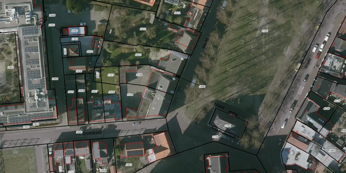 Het perceel waarop Markt 5 staat heeft een oppervlakte van 382 m². Dit is een groot perceel. De perceeloppervlakte wordt geregistreerd door het Kadaster. Gedetailleerde informatie over de maten van dit perceel kunt u vinden in het rapport Kadastrale kaart met maatvoering van Markt 5.