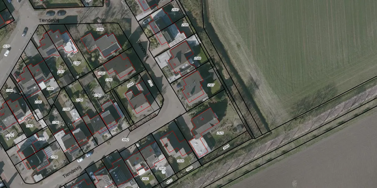 Het perceel waarop Tiendevrij 21 staat heeft een oppervlakte van 407 m². Dit is een groot perceel. De perceeloppervlakte wordt geregistreerd door het Kadaster. Gedetailleerde informatie over de maten van dit perceel kunt u vinden in het rapport Kadastrale kaart met maatvoering van Tiendevrij 21.