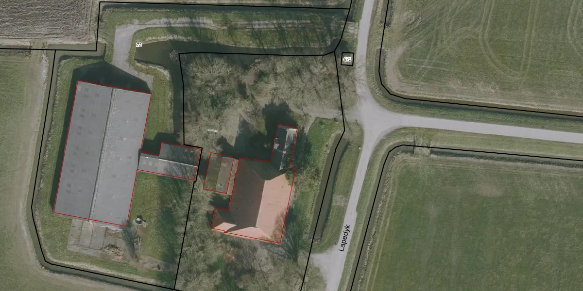 Het perceel waarop Lapedyk 2 staat heeft een oppervlakte van 5200 m². Dit is een zeer groot perceel. De perceeloppervlakte wordt geregistreerd door het Kadaster. Gedetailleerde informatie over de maten van dit perceel kunt u vinden in het rapport Kadastrale kaart met maatvoering van Lapedyk 2.