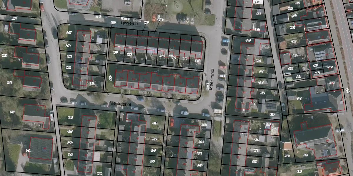 Het perceel waarop Meekeshôf 16 staat heeft een oppervlakte van 904 m². Dit is een groot perceel. De perceeloppervlakte wordt geregistreerd door het Kadaster. Gedetailleerde informatie over de maten van dit perceel kunt u vinden in het rapport Kadastrale kaart met maatvoering van Meekeshôf 16.