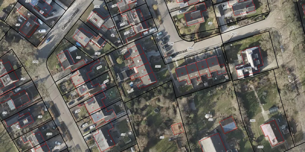 Het perceel waarop Gelmarusstraat 34 staat heeft een oppervlakte van 2045 m². Dit is een zeer groot perceel. De perceeloppervlakte wordt geregistreerd door het Kadaster. Gedetailleerde informatie over de maten van dit perceel kunt u vinden in het rapport Kadastrale kaart met maatvoering van Gelmarusstraat 34.