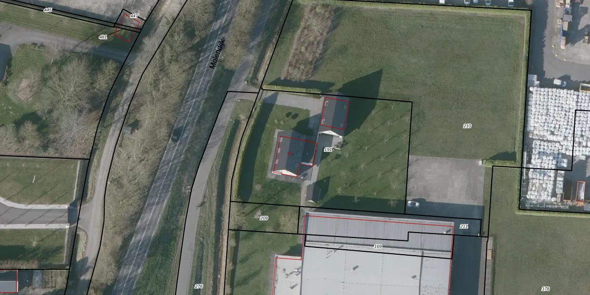 Het perceel waarop Molendijk 40 staat heeft een oppervlakte van 2180 m². Dit is een zeer groot perceel. De perceeloppervlakte wordt geregistreerd door het Kadaster. Gedetailleerde informatie over de maten van dit perceel kunt u vinden in het rapport Kadastrale kaart met maatvoering van Molendijk 40.