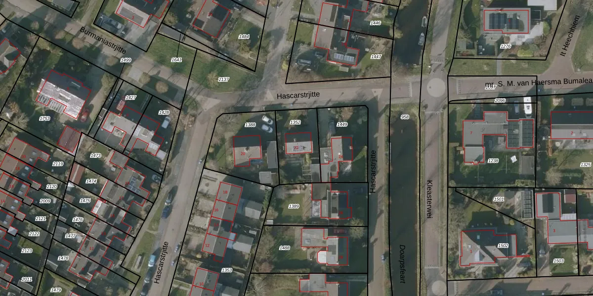 Hascarstrjitte 22 is gelegen op kadastraal perceel SNE00G1352. Deze kadastrale aanduiding is uniek en wordt gebruikt door het Kadaster om eigendomsrechten en andere zakelijke rechten vast te leggen. Het perceel maakt onderdeel uit van de kadastrale gemeente Sneek.