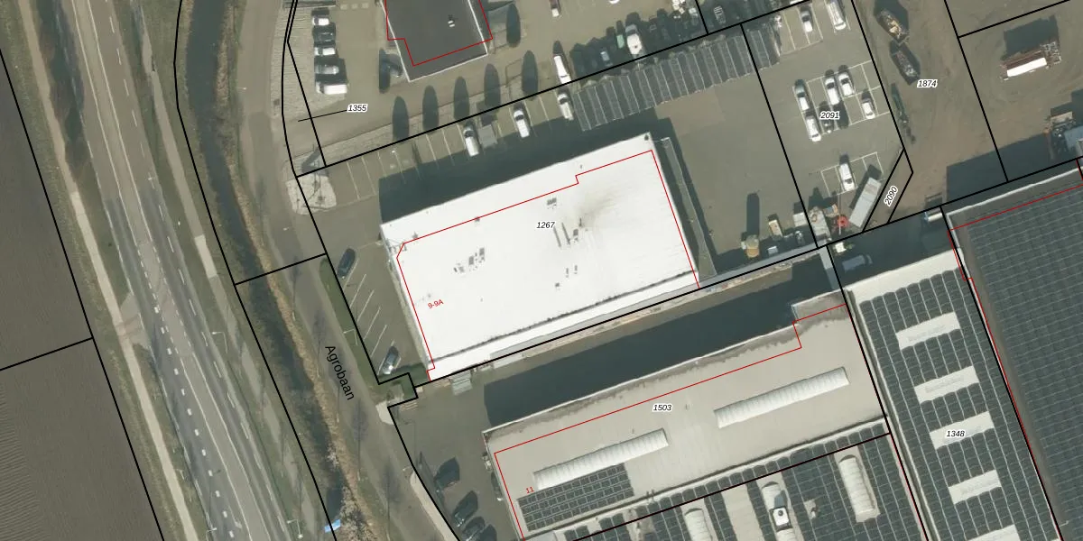 Het perceel waarop Agrobaan 9-A staat heeft een oppervlakte van 3755 m². Dit is een zeer groot perceel. De perceeloppervlakte wordt geregistreerd door het Kadaster. Gedetailleerde informatie over de maten van dit perceel kunt u vinden in het rapport Kadastrale kaart met maatvoering van Agrobaan 9-A.