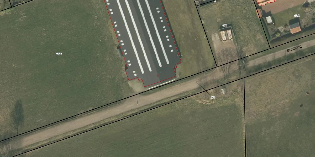 Het perceel waarop Buntweg 12 staat heeft een oppervlakte van 1,2 ha. Dit is een zeer groot perceel. De perceeloppervlakte wordt geregistreerd door het Kadaster. Gedetailleerde informatie over de maten van dit perceel kunt u vinden in het rapport Kadastrale kaart met maatvoering van Buntweg 12.