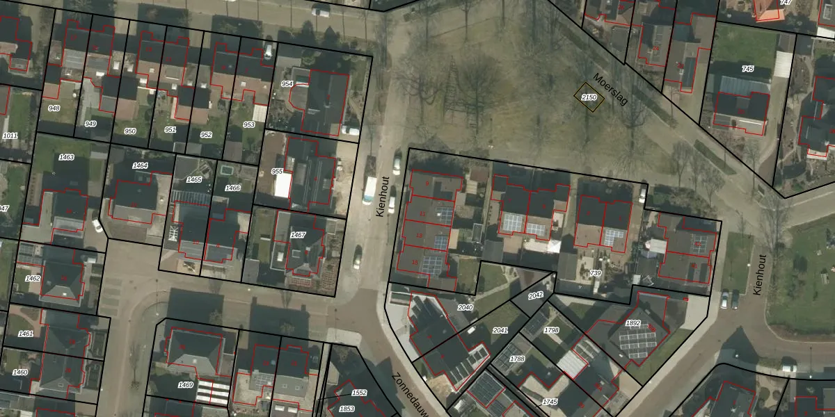 Het perceel waarop Kienhout 11 staat heeft een oppervlakte van 2010 m². Dit is een zeer groot perceel. De perceeloppervlakte wordt geregistreerd door het Kadaster. Gedetailleerde informatie over de maten van dit perceel kunt u vinden in het rapport Kadastrale kaart met maatvoering van Kienhout 11.