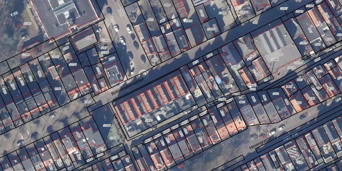 Het perceel waarop Botenmakersstraat 57 staat heeft een oppervlakte van 1028 m². Dit is een zeer groot perceel. De perceeloppervlakte wordt geregistreerd door het Kadaster. Gedetailleerde informatie over de maten van dit perceel kunt u vinden in het rapport Kadastrale kaart met maatvoering van Botenmakersstraat 57.