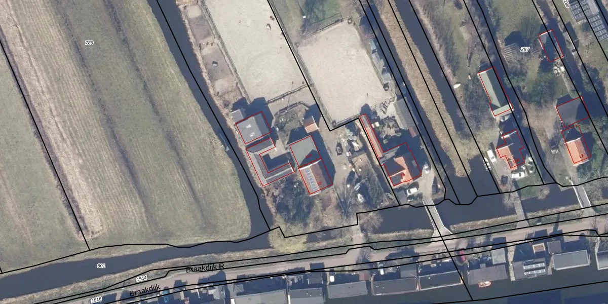Het perceel waarop Braakdijk 15-A staat heeft een oppervlakte van 9980 m². Dit is een zeer groot perceel. De perceeloppervlakte wordt geregistreerd door het Kadaster. Gedetailleerde informatie over de maten van dit perceel kunt u vinden in het rapport Kadastrale kaart met maatvoering van Braakdijk 15-A.
