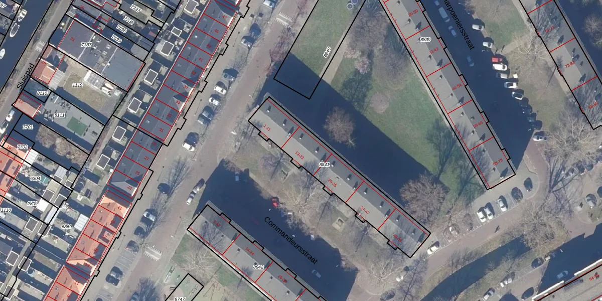 Commandeursstraat 23 is gelegen op kadastraal perceel ZDM01I8841. Deze kadastrale aanduiding is uniek en wordt gebruikt door het Kadaster om eigendomsrechten en andere zakelijke rechten vast te leggen. Het perceel maakt onderdeel uit van de kadastrale gemeente Zaandam.