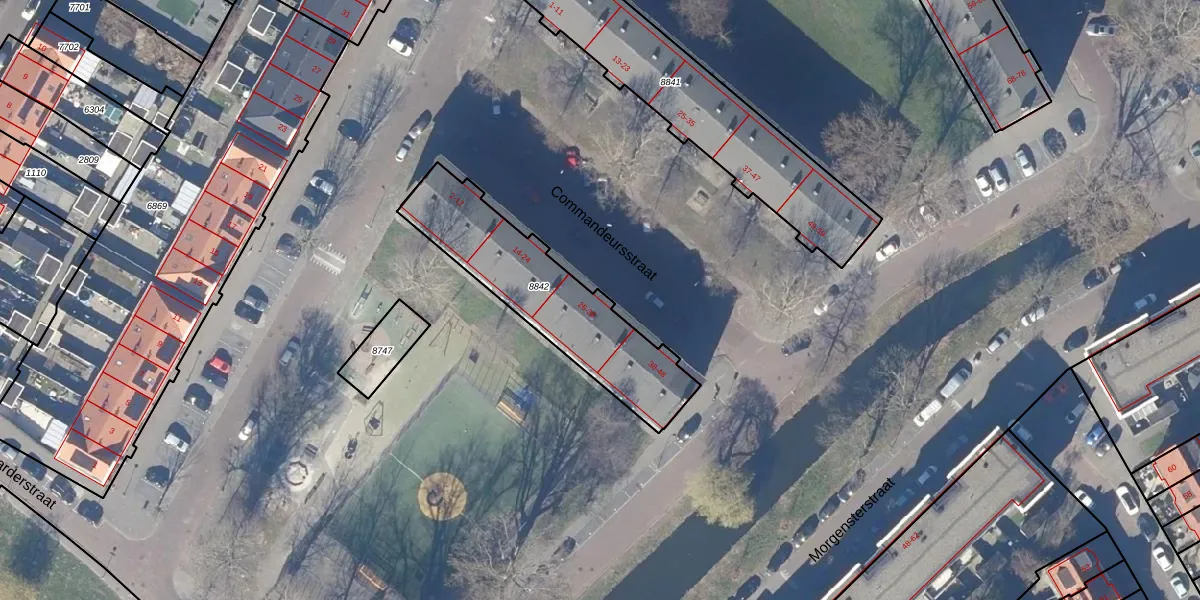 Het perceel waarop Commandeursstraat 30 staat heeft een oppervlakte van 630 m². Dit is een groot perceel. De perceeloppervlakte wordt geregistreerd door het Kadaster. Gedetailleerde informatie over de maten van dit perceel kunt u vinden in het rapport Kadastrale kaart met maatvoering van Commandeursstraat 30.