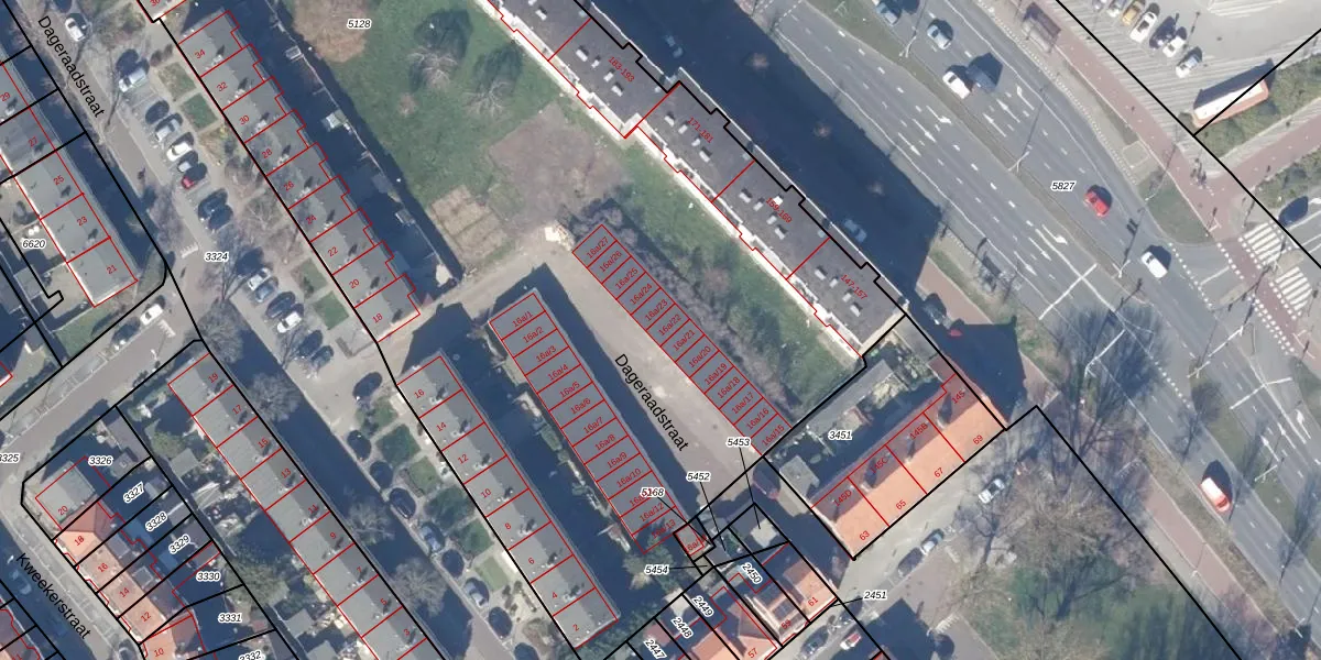 Dageraadstraat 16-a-22 is gelegen op kadastraal perceel ZDM01L5128. Deze kadastrale aanduiding is uniek en wordt gebruikt door het Kadaster om eigendomsrechten en andere zakelijke rechten vast te leggen. Het perceel maakt onderdeel uit van de kadastrale gemeente Zaandam.
