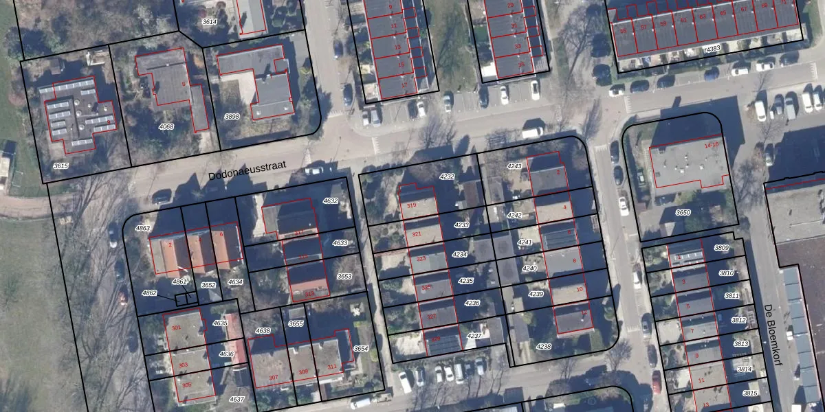 Het perceel waarop Dodonaeuslaan 319 staat heeft een oppervlakte van 376 m². Dit is een groot perceel. De perceeloppervlakte wordt geregistreerd door het Kadaster. Gedetailleerde informatie over de maten van dit perceel kunt u vinden in het rapport Kadastrale kaart met maatvoering van Dodonaeuslaan 319.