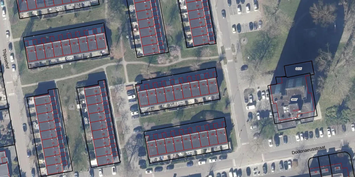 Dodonaeusstraat 45 is gelegen op kadastraal perceel ZDM01D4382. Deze kadastrale aanduiding is uniek en wordt gebruikt door het Kadaster om eigendomsrechten en andere zakelijke rechten vast te leggen. Het perceel maakt onderdeel uit van de kadastrale gemeente Zaandam.