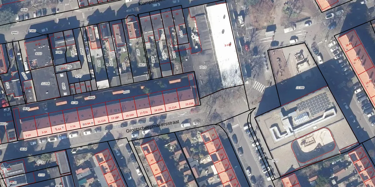 Het perceel waarop Grootscheepmakersstraat 23-A staat heeft een oppervlakte van 1825 m². Dit is een zeer groot perceel. De perceeloppervlakte wordt geregistreerd door het Kadaster. Gedetailleerde informatie over de maten van dit perceel kunt u vinden in het rapport Kadastrale kaart met maatvoering van Grootscheepmakersstraat 23-A.