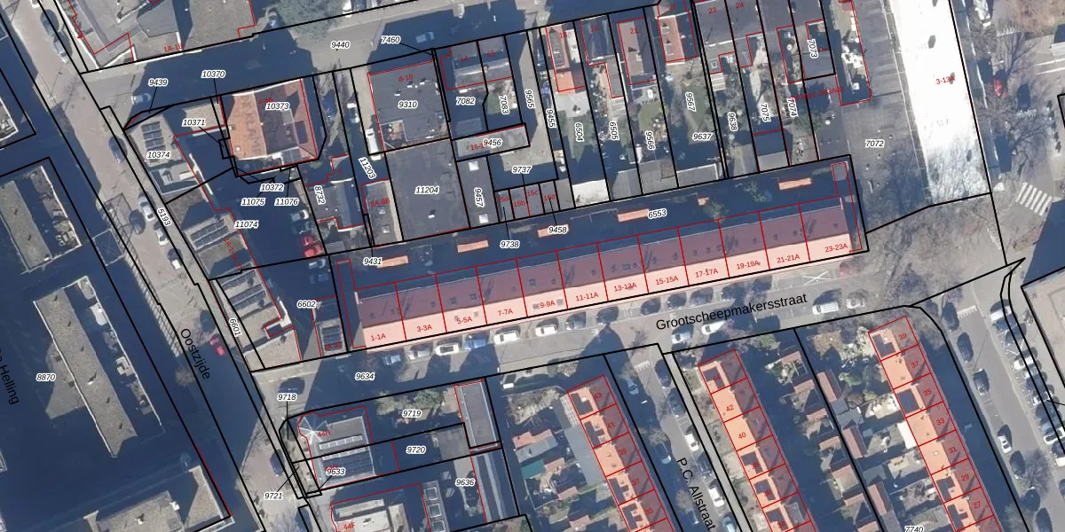 Het perceel waarop Grootscheepmakersstraat 9-A staat heeft een oppervlakte van 1825 m². Dit is een zeer groot perceel. De perceeloppervlakte wordt geregistreerd door het Kadaster. Gedetailleerde informatie over de maten van dit perceel kunt u vinden in het rapport Kadastrale kaart met maatvoering van Grootscheepmakersstraat 9-A.