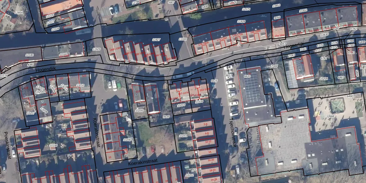 Het perceel waarop Hogendijk 107 staat heeft een oppervlakte van 180 m². Dit is een middelgroot perceel. De perceeloppervlakte wordt geregistreerd door het Kadaster. Gedetailleerde informatie over de maten van dit perceel kunt u vinden in het rapport Kadastrale kaart met maatvoering van Hogendijk 107.