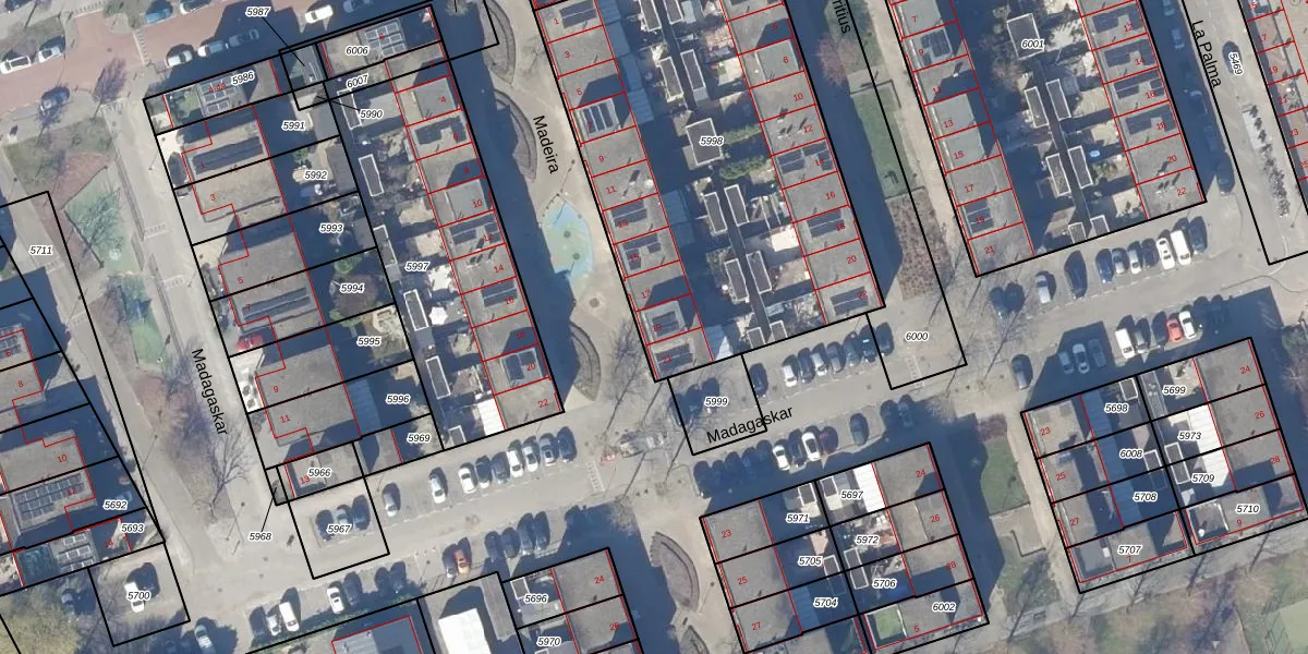 Het perceel waarop Madeira 19 staat heeft een oppervlakte van 2215 m². Dit is een zeer groot perceel. De perceeloppervlakte wordt geregistreerd door het Kadaster. Gedetailleerde informatie over de maten van dit perceel kunt u vinden in het rapport Kadastrale kaart met maatvoering van Madeira 19.