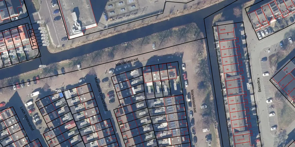 Mandelastraat 13 is gelegen op kadastraal perceel ZDM01K12069. Deze kadastrale aanduiding is uniek en wordt gebruikt door het Kadaster om eigendomsrechten en andere zakelijke rechten vast te leggen. Het perceel maakt onderdeel uit van de kadastrale gemeente Zaandam.