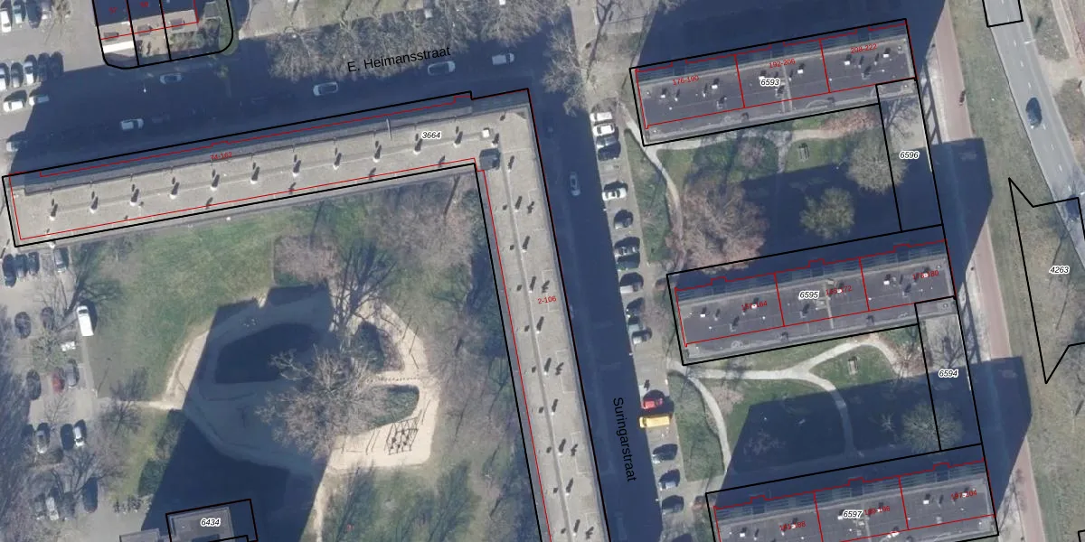 Het perceel waarop Suringarstraat 2-f staat heeft een oppervlakte van 2355 m². Dit is een zeer groot perceel. De perceeloppervlakte wordt geregistreerd door het Kadaster. Gedetailleerde informatie over de maten van dit perceel kunt u vinden in het rapport Kadastrale kaart met maatvoering van Suringarstraat 2-f.